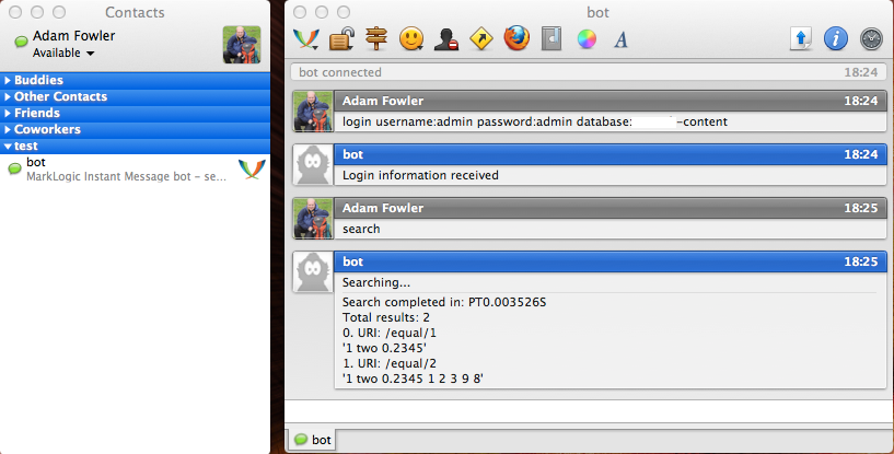 The idea is basically to create a bot like the IRC chat bots of old. I got mine working in three hours from scratch, which includes research time, and performing a search against a MarkLogic database, as you can see from the below picture.