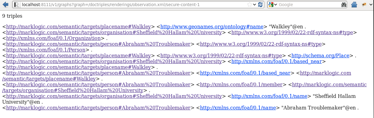 When you hit ‘publish’, as well as updating the document with changes, facts (triples of subject, predicate and object) are added in to MarkLogic 7. Here’s an example of the first section with content, above, in N-triples format (Subject-Predicate-Object on each line):-