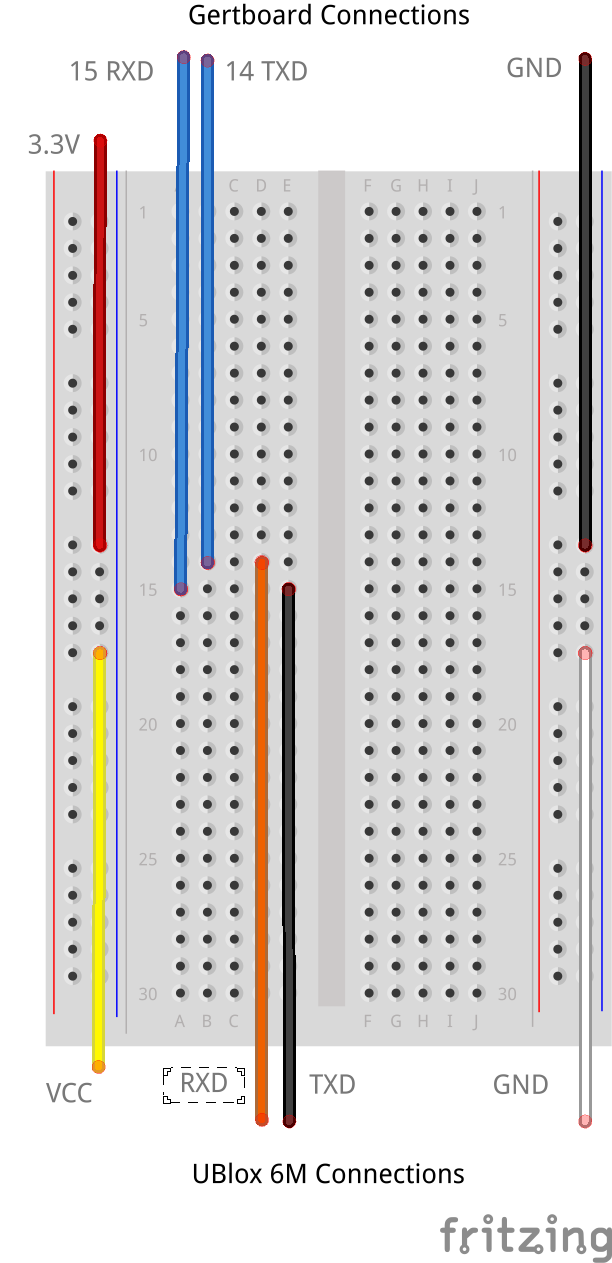 - Connect cable PIN 3-black (TXD or Transmit) to Gertboard row 15 (yes 15 – TX of GPS needs to go to RX of Gertboard)