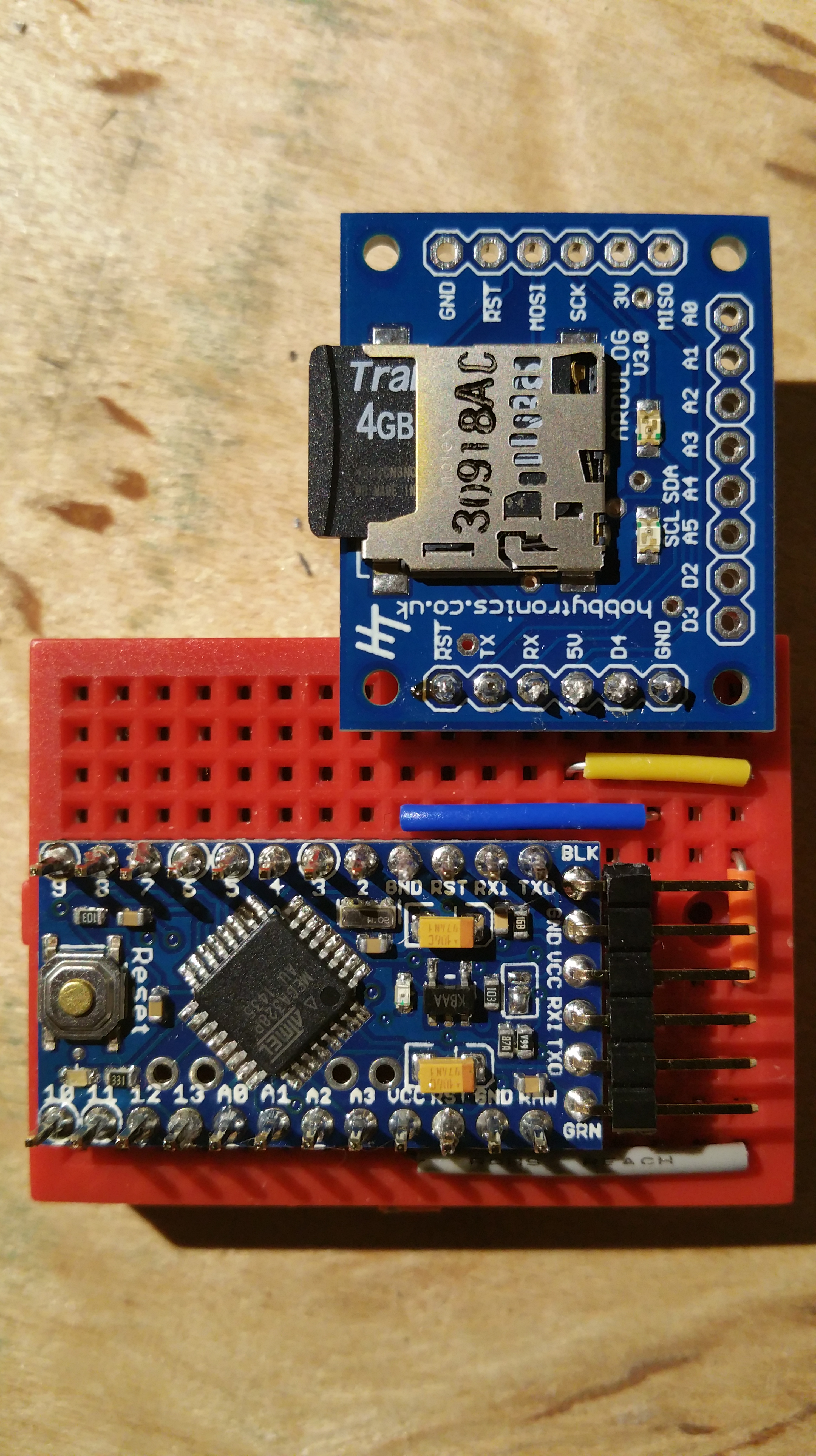 The sharp eyed among you may have noticed the Arduini is a 3.3V 8MHz variant, whereas the power pin on the logger says 5V. You can run 3.3V through here quite happily.